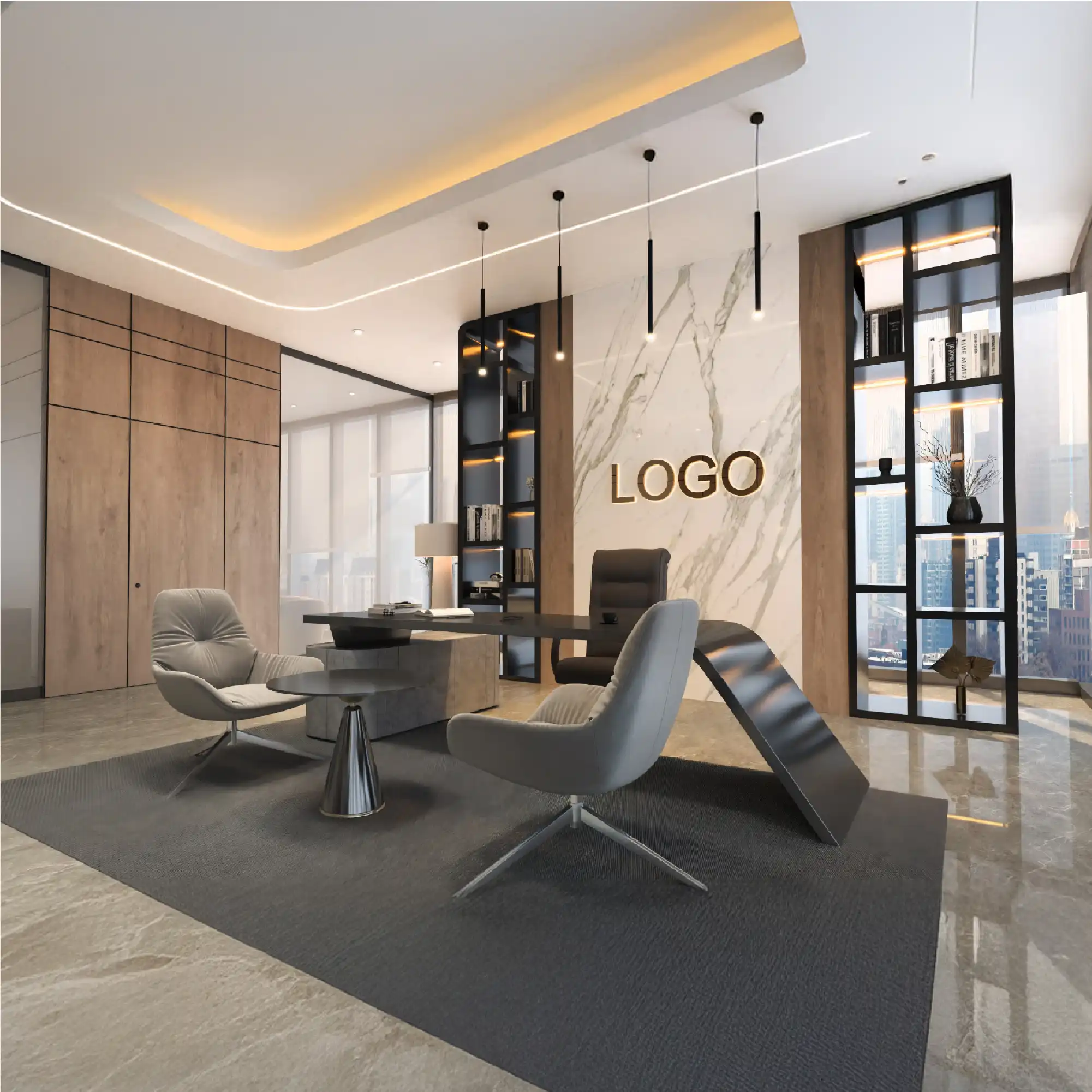 The reception area was envisioned to offer a professional, luxurious, and welcoming experience for visitors and clients alike. The design concept centers around clean architectural geometry, a muted color scheme, and strategically integrated lighting—resulting in a space that is both elegant and efficient.